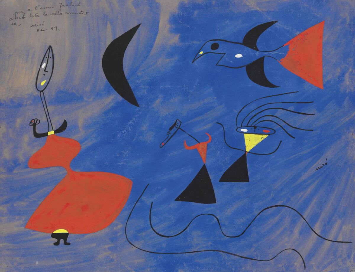 這幅水彩畫是1939年11月繪製的作品,紀錄了米羅與親愛的加泰隆尼亞朋友弗朗西斯·特拉巴爾(Francesc Trabal,1899-1957)的重逢。特拉巴爾當年因法西斯將領佛朗哥擊敗西班牙共和國的忠誠支持者而被迫逃離巴塞羅那,最終進入智利流亡。