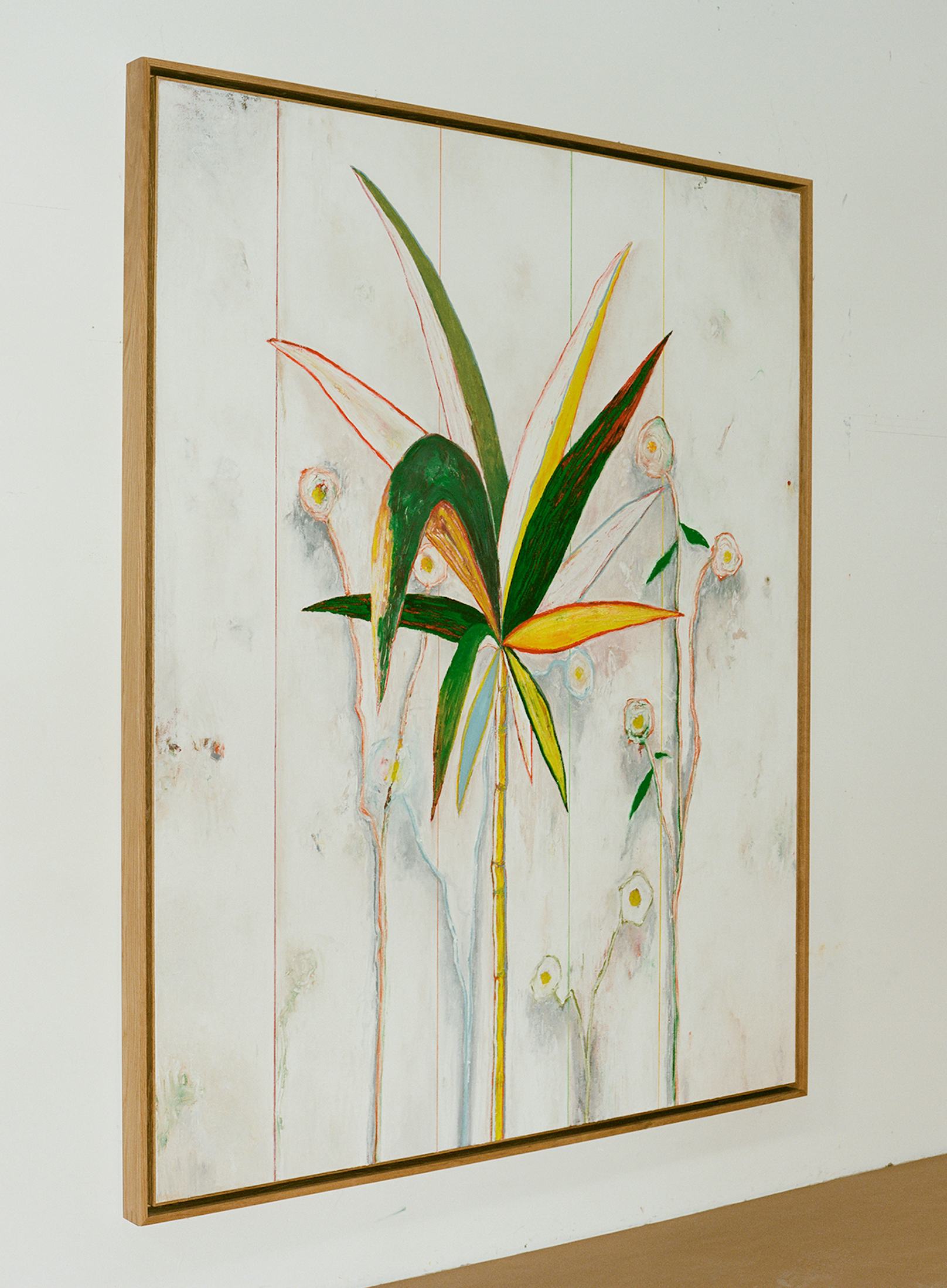 安卡特將具象與抽象相結合,在自然景觀和建築環境中發現了意想不到的詩意時刻。《無題》是一幅充滿活力的作品,以色彩和紋理的細微差別為特徵,在畫布上用油棒和鉛筆描繪了樹木圖案。