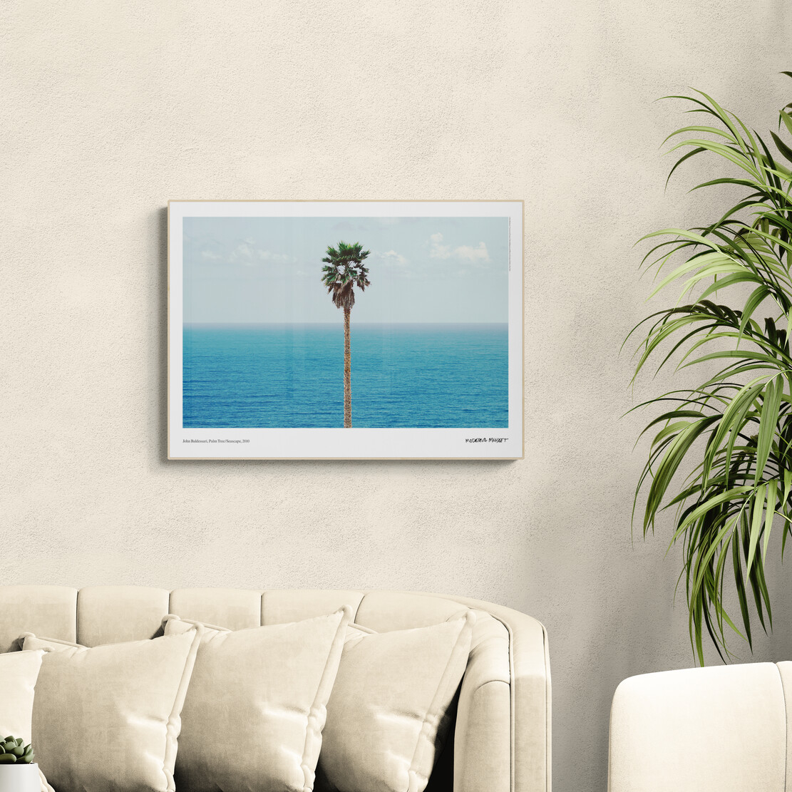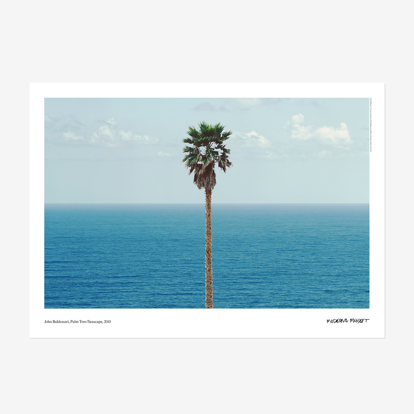 Baldessari 將看似普通的兩張圖像──一棵棕櫚樹與一片海景──並置,然後在每張上方或下方加上文字標籤 “Palm Tree” / “Seascape”。