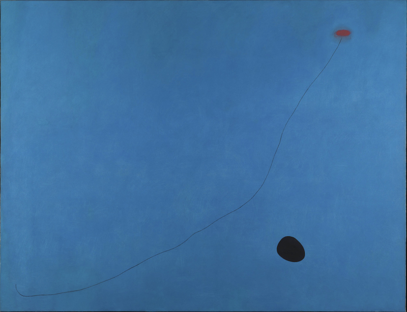 為了讓《藍色 II》畫布上的稀疏之感更加生動,米羅在畫作的左側加入了動感的紅線,並在寧靜的藍色背景上營造出強烈的震撼感。他還使用了多個大膽而明確的黑色圓點,從紅線出發,以水平方向散開,並將這些線條的運動傳遞至整個畫布。這些形狀的巧妙運用,使米羅的作品既充滿活力又具力量感。通過幾何形狀和明亮色彩的精確(但極為自由的)安排,這件大膽的作品栩栩如生,讓觀眾得以一窺米羅未被破壞的潛意識,並真切感受到他今天所聞名的獨特風格。