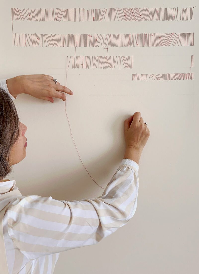 Ana 喜歡使用各種紙張創作,無論是新的還是舊的,但她特別偏好那些陳舊且帶有歲月痕跡的材質:「我非常喜歡使用泛黃的紙張與舊書,我對這些東西幾乎有點上癮,」她笑著說。最近,她開始創作一系列大型作品,運用紅色線材「縫製」圖像——實際上是用針線而不是鉛筆來描繪主題。
