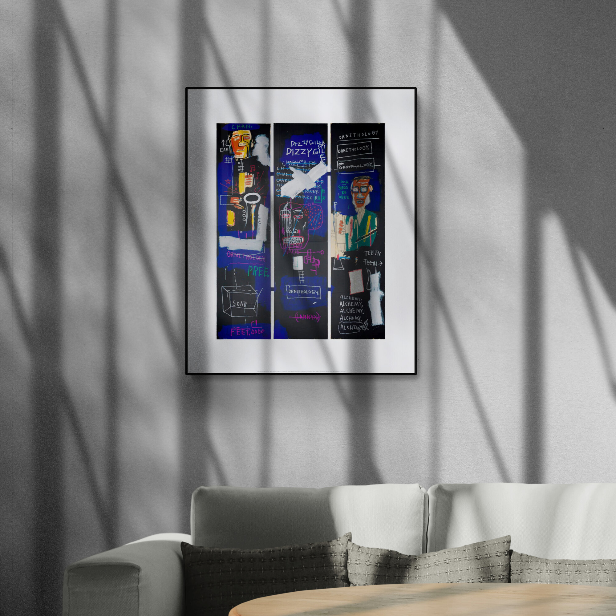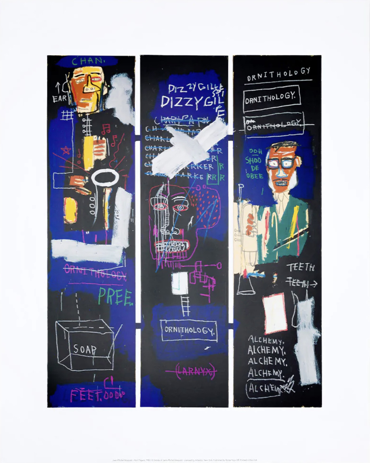 喇叭演奏家 (1983 年)——最初是在安裝在木支架上的三個大型帆布面板上用丙烯酸和油畫棒創作的——是 Broad 系列中的一件重要藝術品。在這幅畫中,讓-邁克爾·巴斯奎特 (Jean-Micheal Basquiat) 頌揚了兩位著名的爵士音樂家——薩克斯手查理·帕克Charlie Parker 和小號手 Dizzy Gillespie,這幅畫充滿了音樂氛圍。