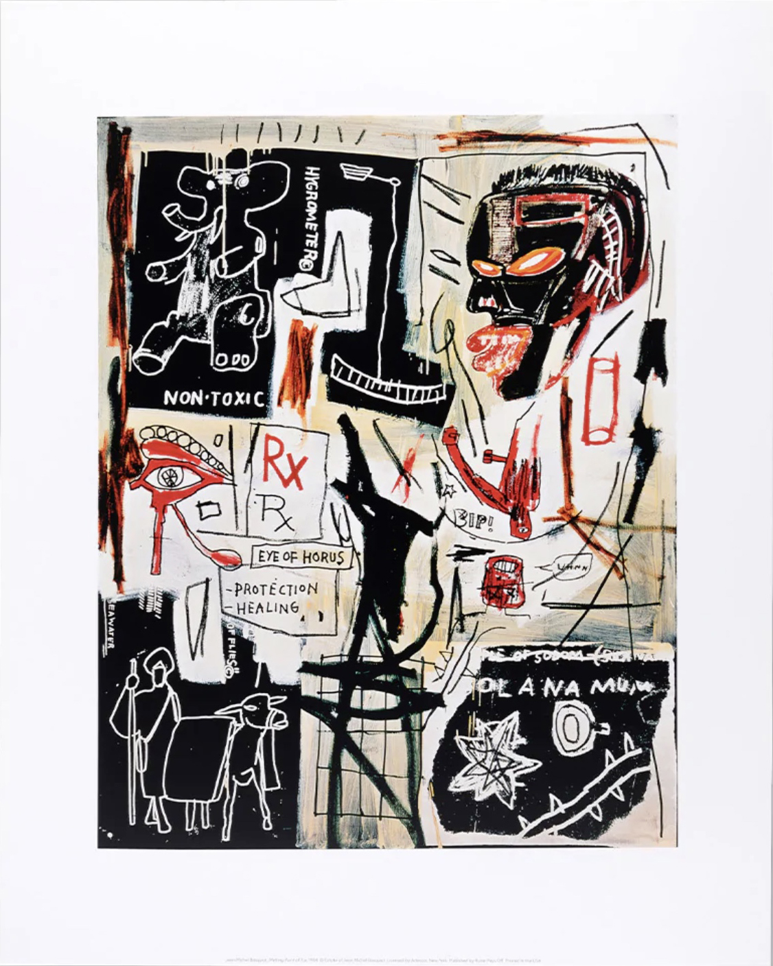Melting Point of Ice (1984) by Jean-Michel Basquiat—originally done in acrylic, oilstick, and silkscreen—is exquisitely reproduced and available exclusively . Basquiat explores and questions many themes around blackness, its glories, histories, and pain, as he confronts colonialism, slavery and discrimination.