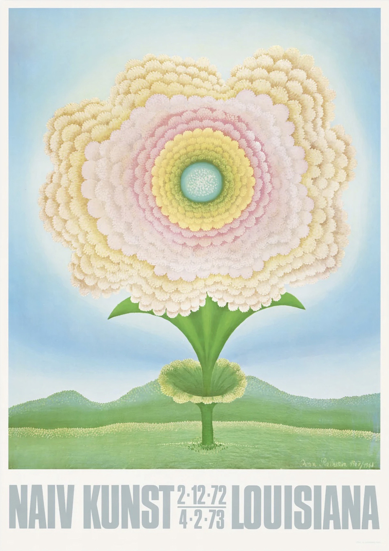 展覽海報,上面是藝術作品「Hiroshimas blomst」(1968),是由克羅地亞藝術家 Ivan Rabuzin 創作,並於1972年在 Louisiana 參加了名為「Naiv Kunst」的藝術展覽。