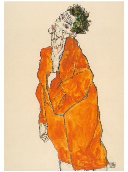 在橙色夾克的自畫像中,短袍看起來精緻光滑,幾乎優雅,而在選擇鮮豔色彩上更是奢華極了。然而,這位文雅的藝術家-精神上的存在在這個世界中顯得有些迷失,他疲憊地閉上了眼睛,帶著一種憂鬱的順從感。