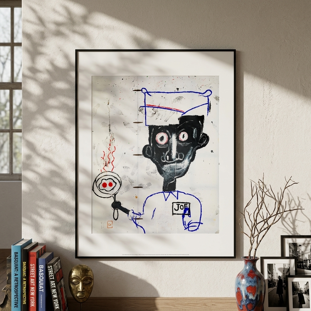 Bring bold flair to your home with this archival print by Jean-Michel Basquiat. His Eyes and Eggs (1983) artwork—originally done in acrylic, oilstick, and paper collage and part of the Broad collection—is printed on Monte Carlo 300gsm watercolor paper. The work comments on aspects of human existence and challenges what we choose to see or choose to accept in the world around us. It serves as a reminder of the everyday moment that we often take for granted: the labor that goes unseen, the eggs that we eat without any gratitude for where they came from, and the consequences of such blind actions.