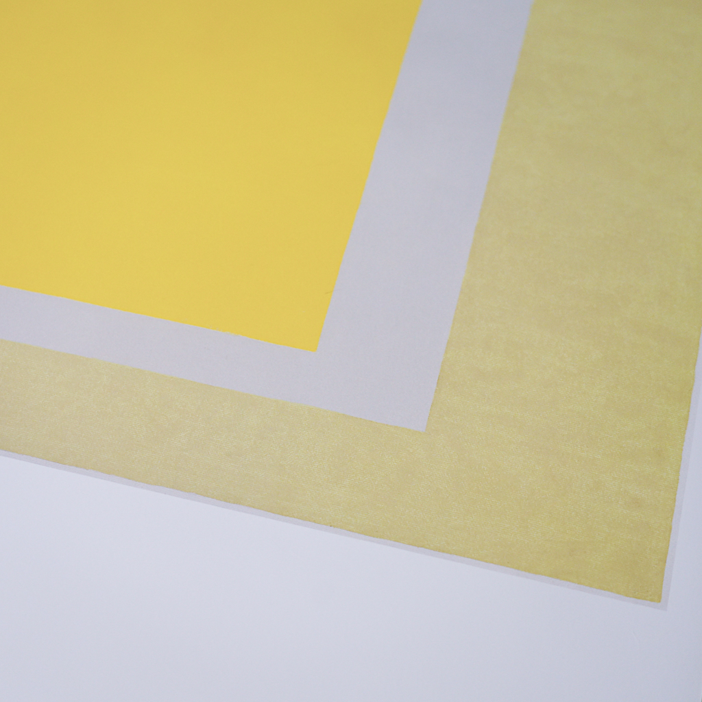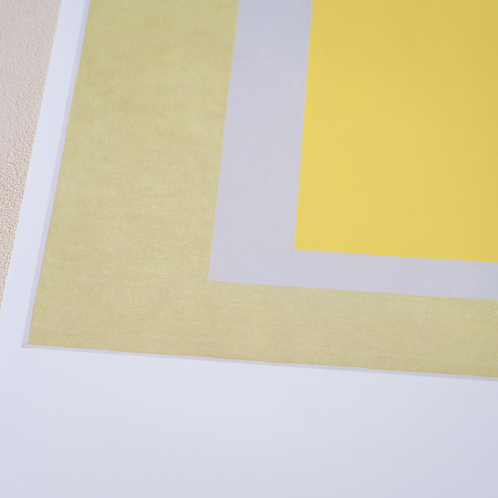 他最著名的系列作品是從 1950 年代開始創作的 《向方形致敬》(Homage to the Square)。這一系列以精確的幾何構成為基礎:多層次的正方形彼此嵌套,每層方形以不同色彩塊構成,排列於畫布中央。畫面乍看簡單,卻極具變化——Albers 透過顏色的冷暖、明暗、飽和度對比,揭示色彩之間如何相互影響、產生視覺錯覺與心理感受。他強調「色彩沒有固定的意義,只有在對比中才能被理解」,這也是他著作 《色彩的互動》(Interaction of Color, 1963) 的核心理念。該書被視為藝術教育史上的經典教材,至今仍被世界各地的設計與藝術學院採用。