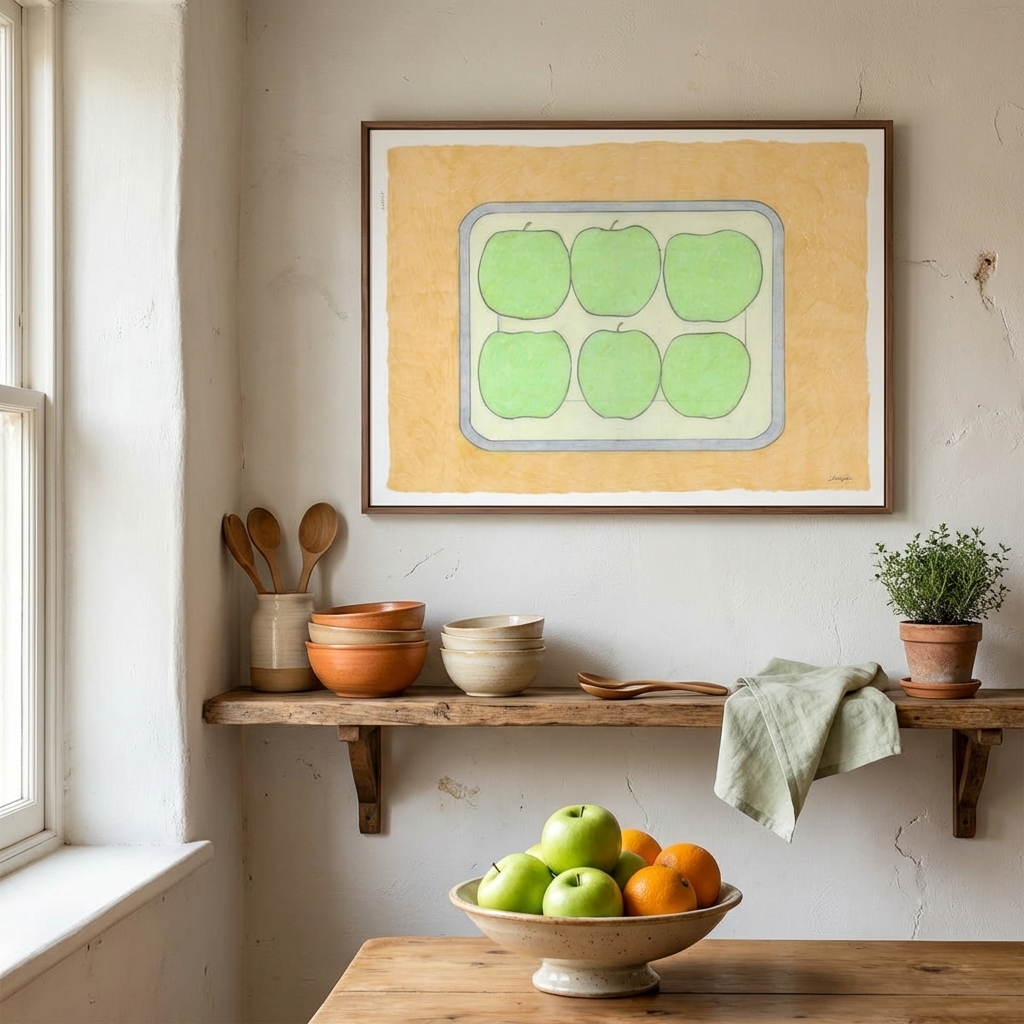 授權的6幅作品,有從袋中滾到廚房桌面上的李子、