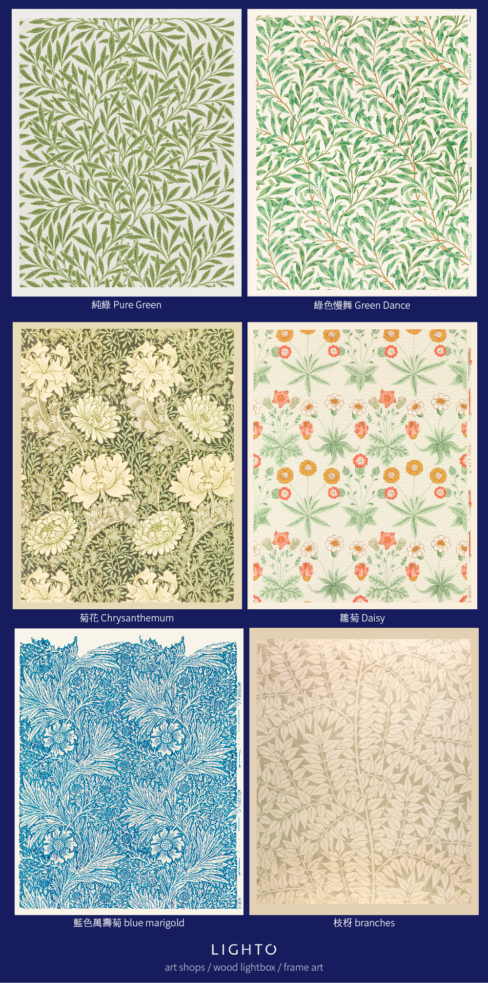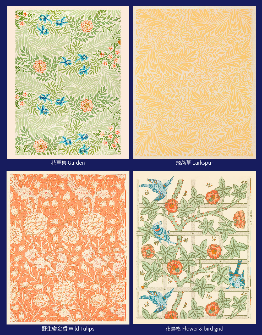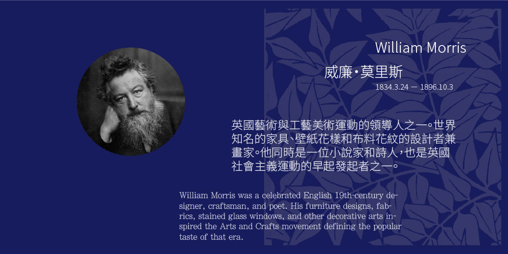 威廉.莫里斯(W. Morris, 1834-96),十九世紀中葉英國美術工藝運動推動者,倡導藝術與日常生活的結合,仿中世紀籌組商會,召集同好,並將設計量產,商品領域含括壁紙、掛毯印花設計、教堂裝飾、家具、玻璃器皿與金銀細工等,是往後歐洲興起新藝術運動的先驅,同時開啟了藝術家多元性參與設計領域的潮流。