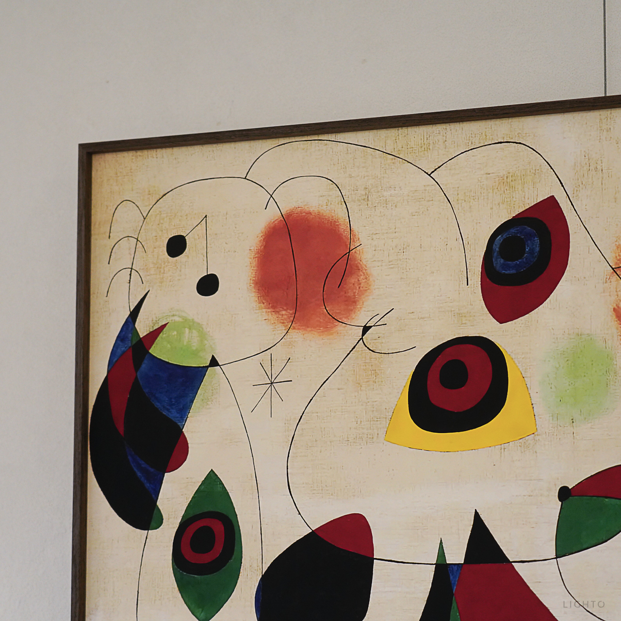 米羅曾與超現實畫派關係密切,這些超現實主義者態度開放,也擅用不同媒界創作,一直在嘗試融合詩畫二事,米羅曾將一首詩拆開,成為他繪畫的題目,又嘗試在畫裡表達他的詩意性,米羅的畫雖然被認為是抽象畫,但很多時候他筆下繪畫的都是符號,而從符號之中,大概可見到它是星星、月亮,或是一隻小狗/動物。比較起全抽象繪畫,它們更見到米羅深受超現實主義影響,「他曾經歷兩次世界大戰,還有一次西班牙內戰,那年代再見證特權階級統治,他是因為避難,才在鄉間居住,在沙灘裡仰望星空,啟發了他繪畫星座系列(Constellations,1940-1941)。及後他開始用星星月亮太陽來作畫,而星座系列成了他的標誌性語言。」談到他受的藝術影響,羅館長說米羅大約在三十歲到了巴黎,當年巴黎是世界最前衛的藝術中心,各個畫派百家爭鳴,他除了較受到影響的其實超現實主義,還有達達主義和立體派,「據他自言,他會從每個畫派之中學習,但他不承認自己屬於任何一個畫派。」