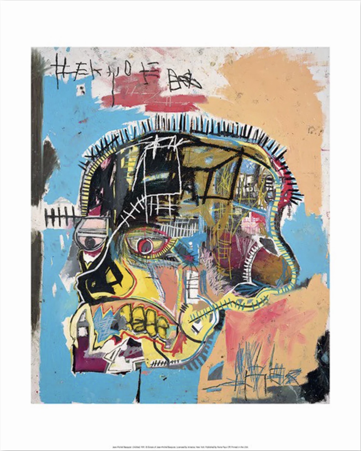《無題(頭顱)》 可能被認為是自畫像的一種形式。這裡的頭骨存在於生與死之間。眼睛無精打采,臉凹陷,頭部看起來切除了,而且很柔和。然而,狂野的色彩和充滿活力的痕跡表明內部活動過多。