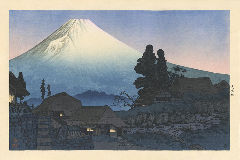 1907年,他被渡邊莊三郎聘為旗下的第一位畫師,並以「松亭」為筆名,這既是對浮世繪巨匠歌川廣重的致敬,也標誌著其藝術生涯的重要轉折點。與渡邊的合作產生了許多深受收藏家喜愛的作品,並持續多年。松亭最受矚目的貢獻之一,是他對夜景的細膩描繪——他能巧妙捕捉光與影的交錯,以及月光、燈籠營造的氛圍效果。這些夜景作品,如寧靜街道、寺院、田園夜色等,特別受歡迎,也奠定了他作為夜景版畫大師的地位。