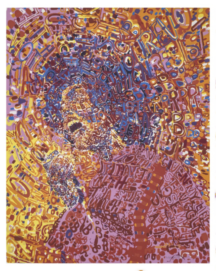 1968 年,Wadsworth Jarrell 與他的配偶、時裝設計師 Jae Jarell 以及藝術家 Barbara Jones-Hogu、Jeff Donaldson 和 Gerald Williams 共同創立了 COBRA(黑人革命藝術家聯盟)。女性不僅在著名的黑人藝術運動集體(後來更名為 AfriCOBRA(非洲不良藝術家公社))中發揮核心作用,而且還是黑人權力運動的標誌性領袖。 Jarrell 在這裡慶祝著名的激進活動家和知識分子安吉拉·Y·戴維斯 (Angela Y. Davis),她仍然是世界各地爭取種族、性別和經濟正義的領導者。這幅肖像結合了戴維斯的話、Black Power 口號和 AfriCOBRA 標誌性的鮮豔色彩,描繪了她激進主義的強度和力量。
