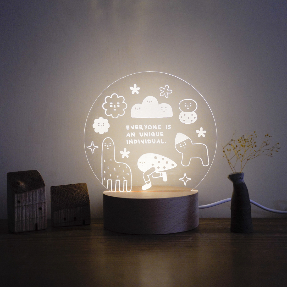 壓克力雷雕作品、山毛櫸實木底座、五段調光控制器、USB插頭,可使用手機充電器、行動電源、電腦USB孔點亮。