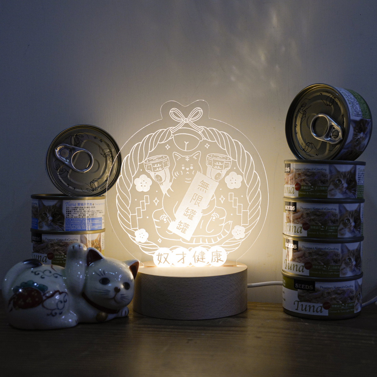 壓克力雷雕作品、山毛櫸實木底座、五段調光控制器、USB插頭,可使用手機充電器、行動電源、電腦USB孔點亮。