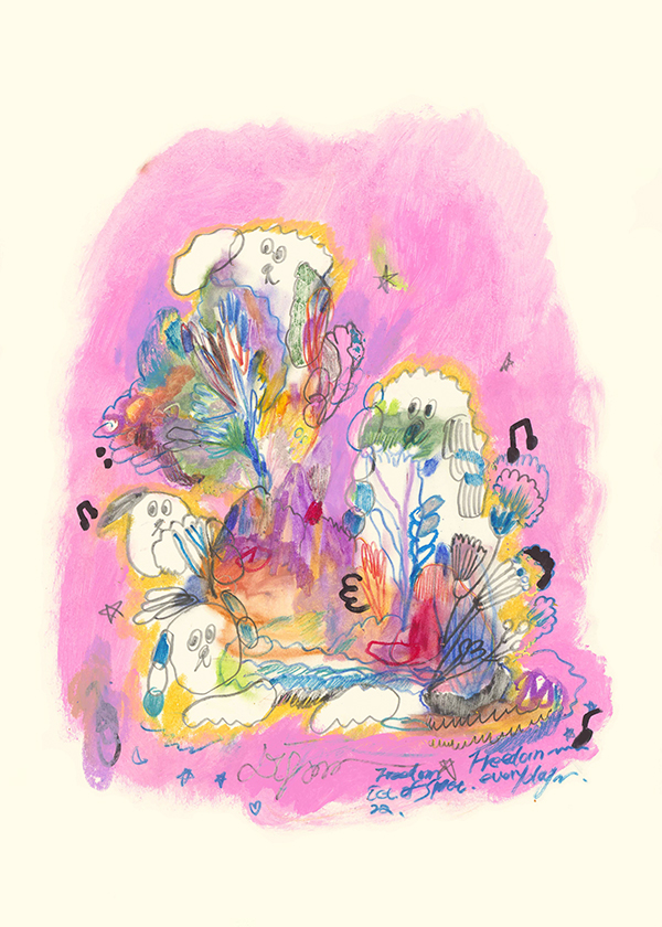 也常以原子筆描繪看似隨手塗鴉、卻充滿豐富細節的畫作。