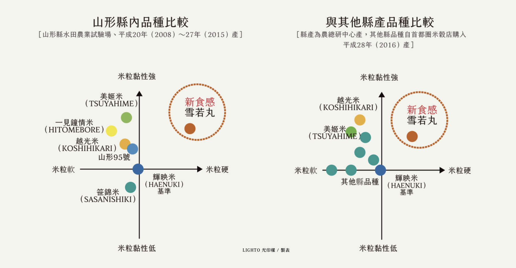 *可以看到山形縣在開發米的新品種的時候,依照目前的米的特性分佈,找出了一個還沒有品牌的特性區域,也就是米較硬、黏性也強的市場區塊。