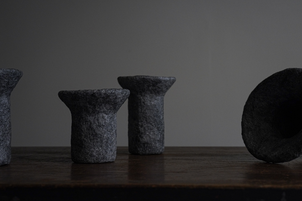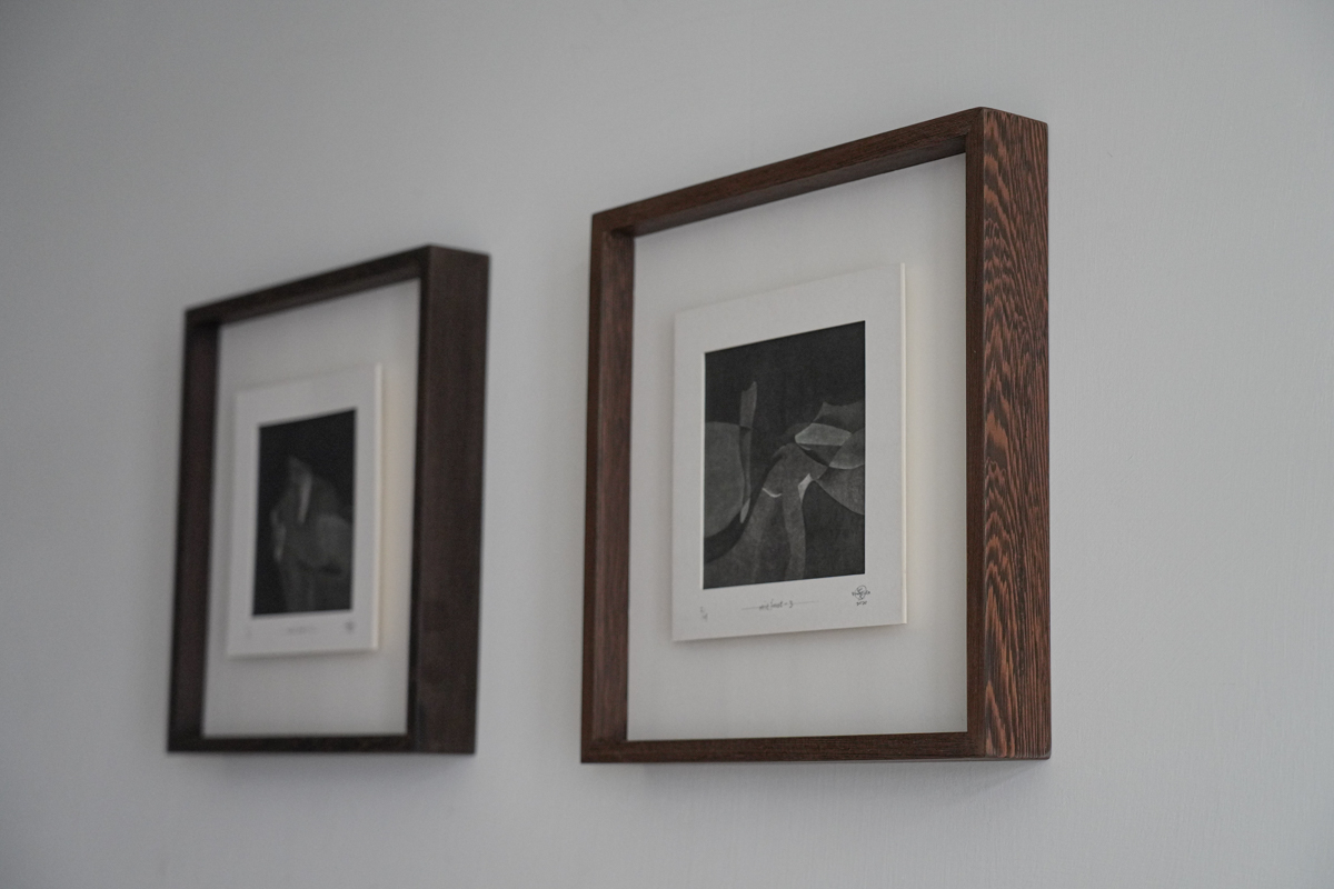 此次個展展覽主軸是七件燈箱,以版畫紙雕塑形塑出光線的閾(ㄩˋ),透過印有版畫的宣紙層層疊疊,讓畫面在有光與無光之間遼闊。背景的老屋空間中,我們會將植物與厚實的斜口花器搭配,或許旁邊散落幾只石板模樣的小圓皿,然後,收攏在幽黑微光的美柔汀銅版畫作裏。
