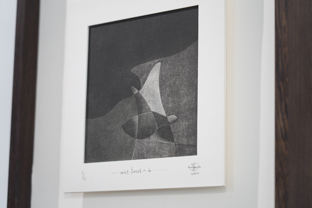 美柔汀銅畫的作品-「黯霧森林」,此技法極度費力勞神,具有精密豐厚的階調及靈活多樣的表現手法,是版畫中最能展現細膩柔美的一種,她藉由色塊的交錯與堆疊,在小小方寸之間營造了迷濛交錯的開闊森林感。