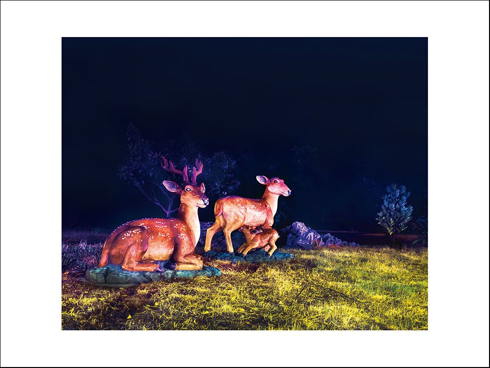 大型相機創作,拍攝一百多尊台灣大小公園廟宇之動物雕像,環島二十餘次,歷時六年。作品起源於眼睛看到的與再現影像是否為真實的思考,試圖製造一種超越現實的幻像。在黑暗中使用自創的光繪畫技法,以手電筒長曝兩小時進行打光,像是招魂的儀式,讓動物雕像在影像之中活起來。透過光影的與蛇腹移軸變形,凸顯動物雕像的神韻,讓雕像具有生動的靈性。