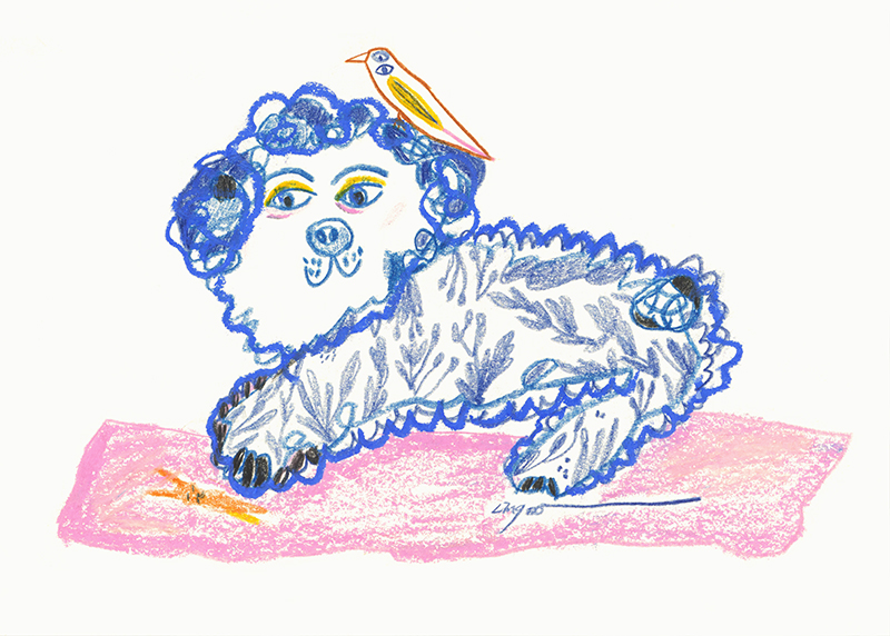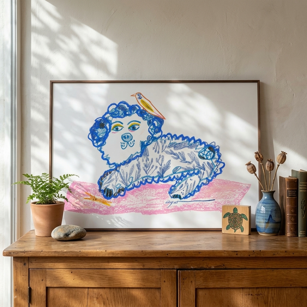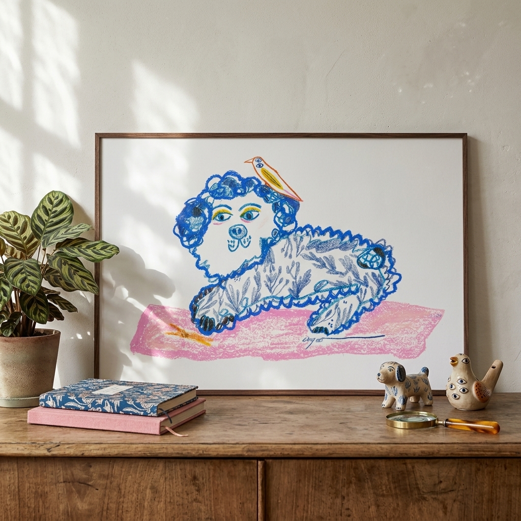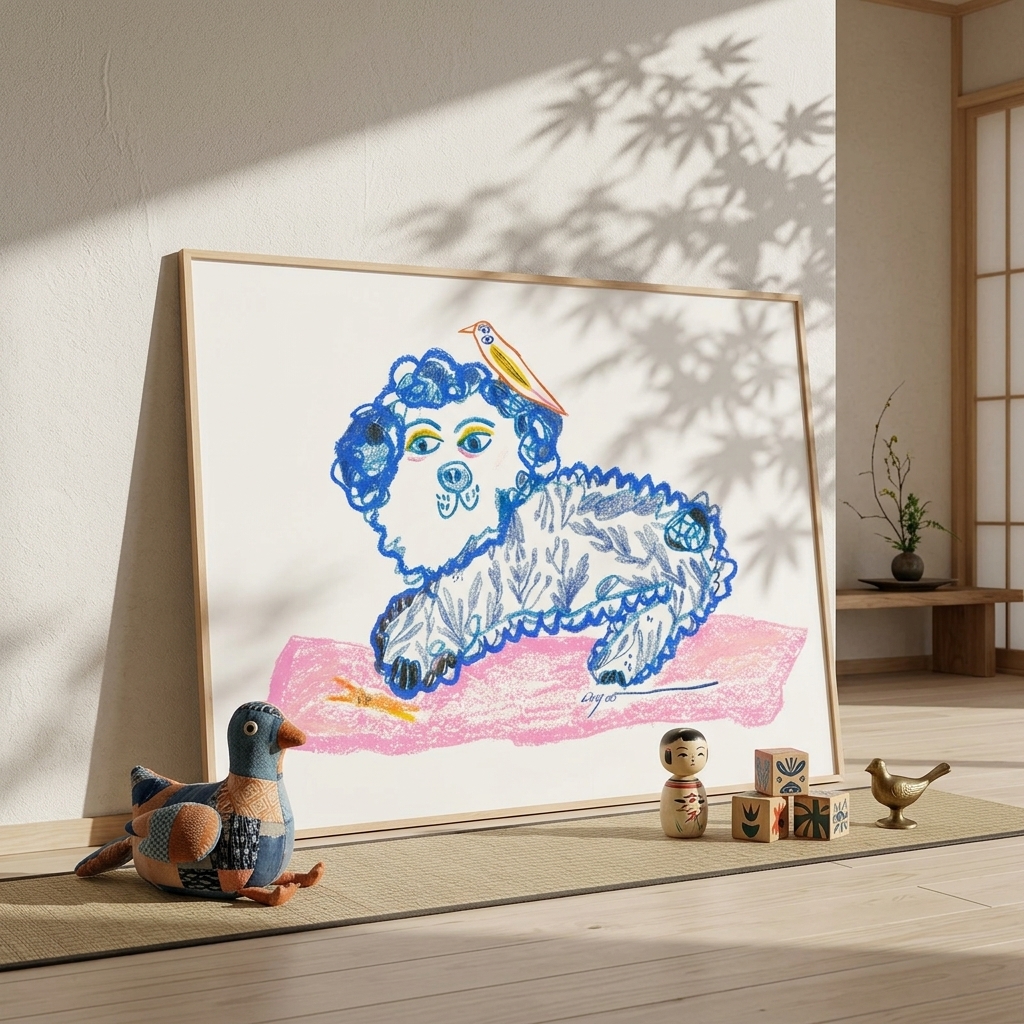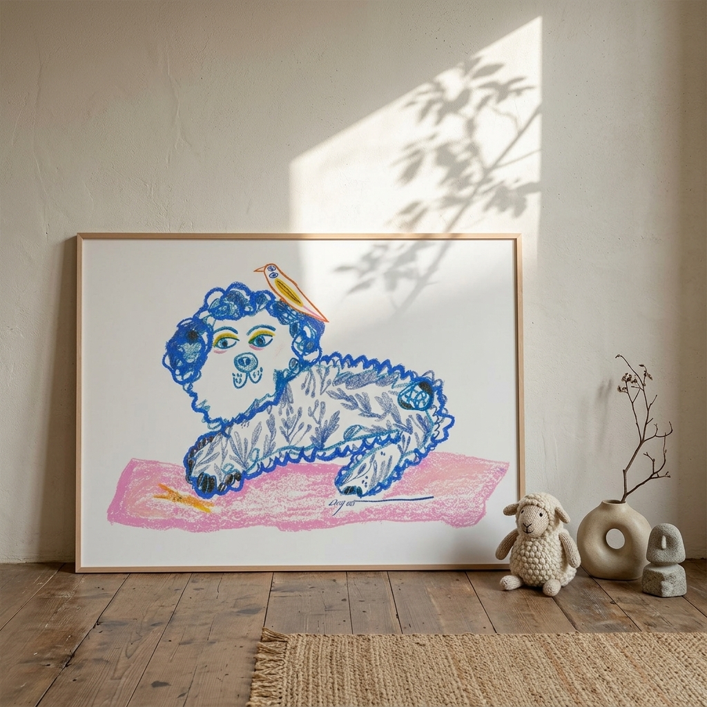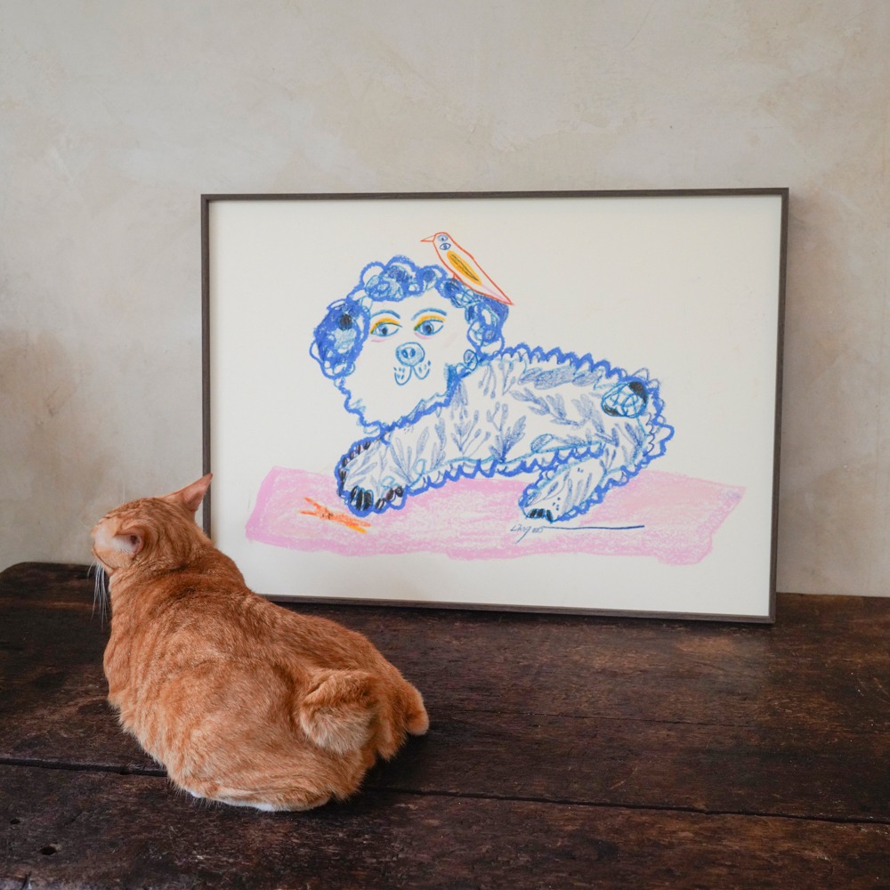 作品名稱:Lingoooo 005 狗狗與小鳥 (實品拍攝 / 霧金色鋁框/ 無壓克力)