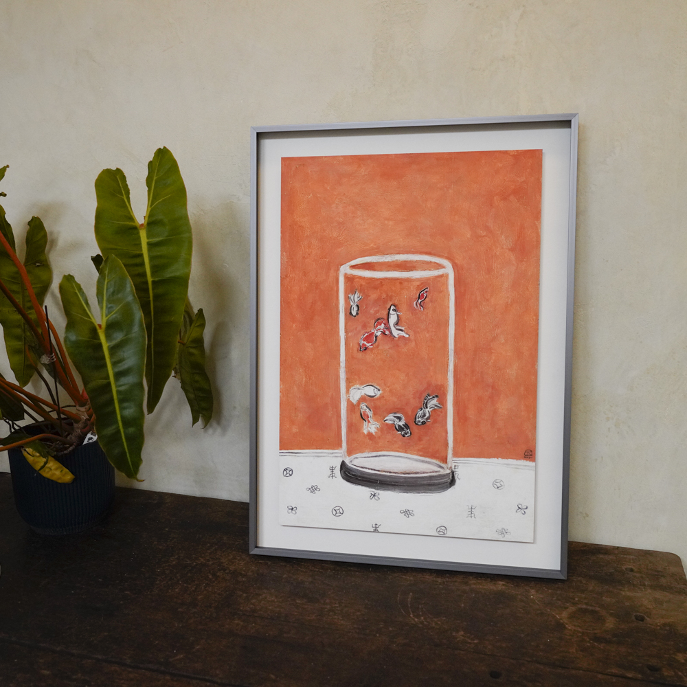 金魚為原產於中國的魚種,兩千年前古書《山海經》上即有記載:「睢水出焉,東南流注於江,其中多丹粟,多文魚。」其中丹粟與文魚,即指丹紅色與多彩的金魚。在唐宋時期,養殖金魚賞玩成為宮廷雅趣,金魚並帶有「連年有餘」的吉慶寓意,其形象亦常出現在皇室、貴族使用的杯具、器皿之上。常玉自1921年赴法,曾多次將此故國遊魚入畫,如在《荷花與金魚》與六聯屏《荷塘白鶴》均可見。在多數作品中,水中游魚僅為配角,然而在此《八尾金魚》之上,常玉首度將魚兒提升為畫中主角,回顧其創作,此絕無僅有,珍罕絕倫。