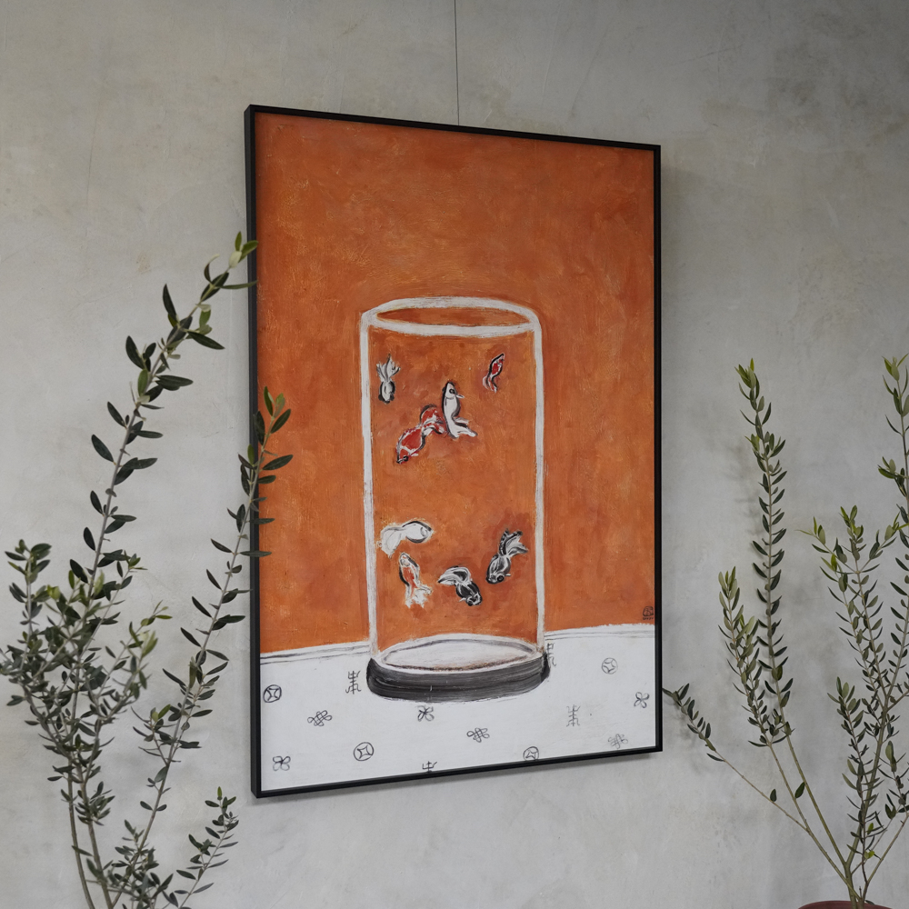 有別於藝術家30年代以粉紅與白為主調的「粉紅時期繪畫」,在《八尾金魚》中,常玉大膽地以富涵東方民族系譜的鮮明配色調度畫面,他採橘紅與白為主色,將畫布分為上下兩大塊面,下半為桌,上半為其所依傍的牆,簡練卻又完美地指示了空間的對應關係。在中心主體上,他以具書法性的遒勁線條,自信地勾勒出一透明的魚缸,與八尾在瓶中迴旋嬉戲,帶有朱砂胭紅、白與墨色的小金魚。由其明確的運筆速度,可感受藝術家濃烈的自信與成熟,以及強烈的東方寫意精神,尤其在對於魚兒神韻的掌握,十足生動。而魚缸在構圖上連結了上下兩個空間,也讓色彩有了延伸,整體富麗非凡。染著黑灰色的大筆刷一筆畫出支撐缸底的墊子,塑造出立體感;畫龍點睛的黑彩,讓魚兒突顯在一片橘紅的背景中。