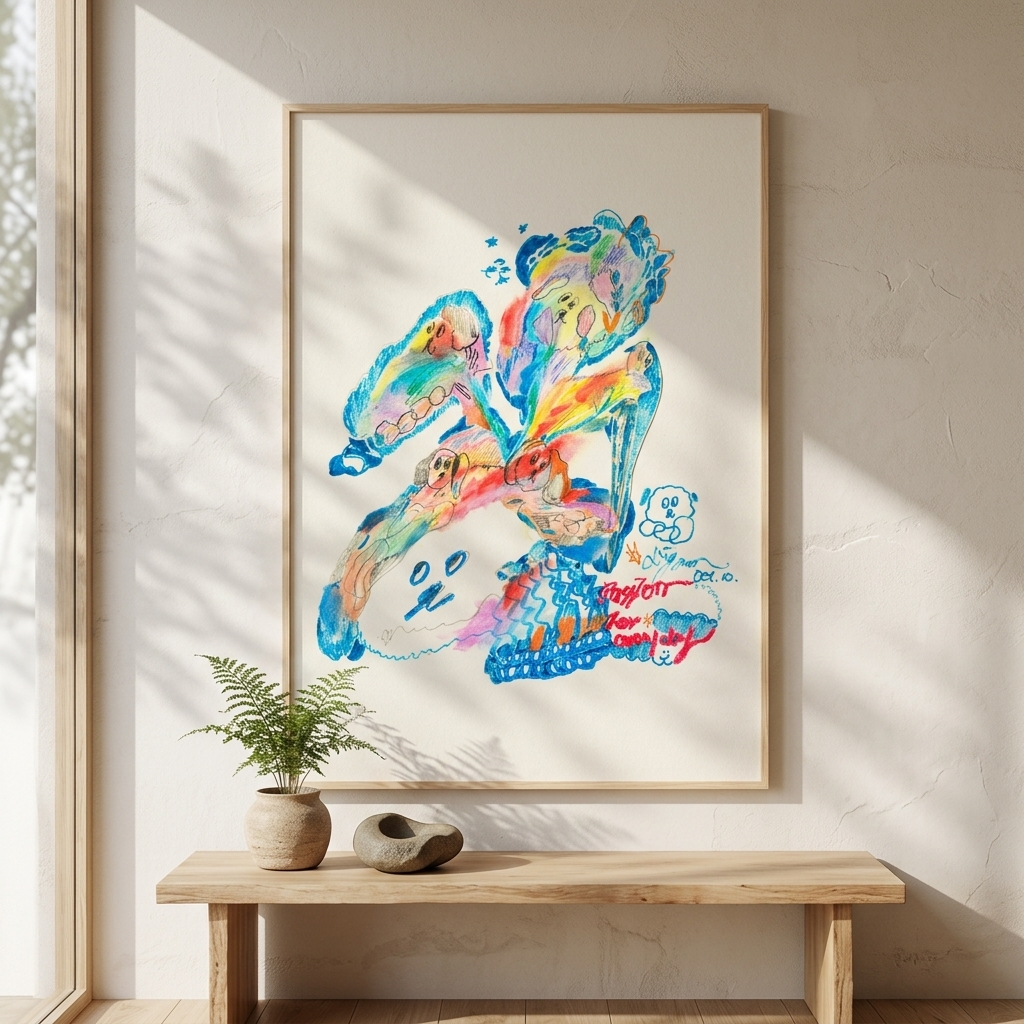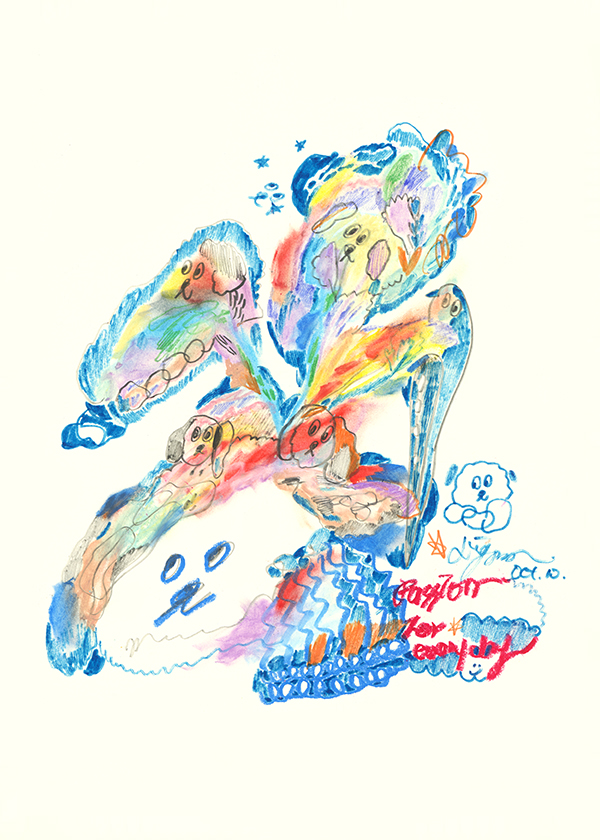也常以原子筆描繪看似隨手塗鴉、卻充滿豐富細節的畫作。