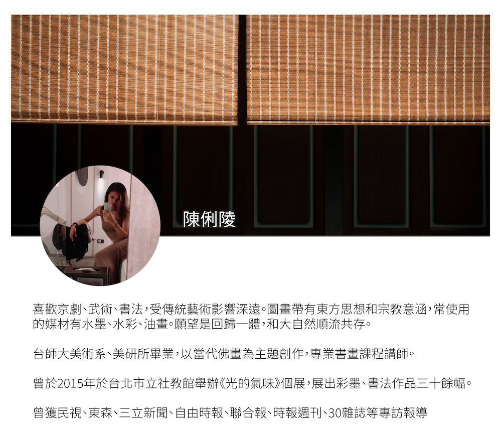 台師大美術系、美研所畢業,以當代佛畫為主題創作,專業書畫課程講師。