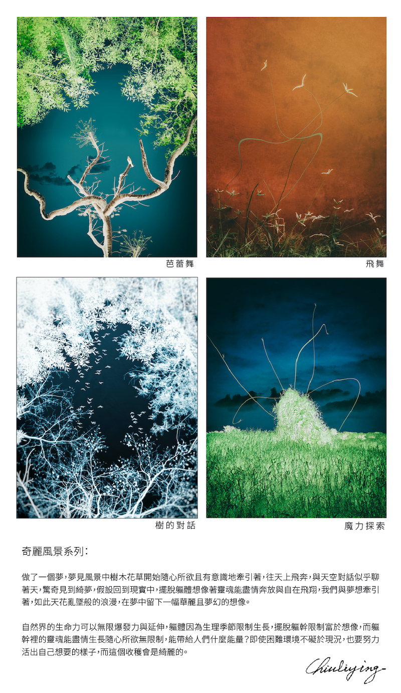 做了⼀個夢,夢⾒風景中 樹⽊花草開始隨⼼所欲且 有意識地牽引著,往天上 ⾶奔,與天空對話似乎聊 著天,驚奇⾒到綺夢,假 設回到現實中,擺脫軀體 想像著靈魂能盡情奔放與 ⾃在⾶翔,我們與夢想牽 引著,如此天花亂墜般的 浪漫,在夢中留下⼀幅華 麗且夢幻的想像。