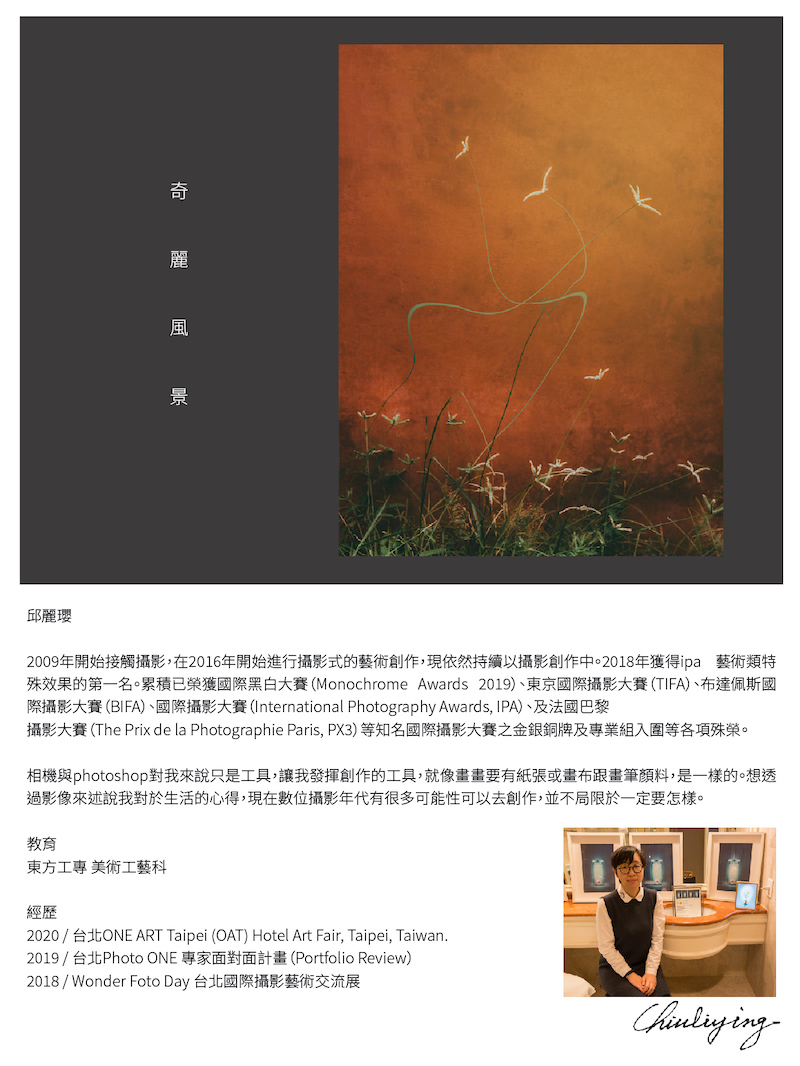 2009年開始接觸攝影,在2016年開始進⾏攝影式的藝術創作,現依然持續以攝影創作 中。2018年獲得ipa 藝術類特殊效果的第⼀名。累積已榮獲國際⿊⽩⼤賽 (Monochrome Awards 2019)、東京國際攝影⼤賽(TIFA)、布達佩斯國際攝影⼤ 賽(BIFA)、國際攝影⼤賽(International Photography Awards, IPA)、及法國巴黎 攝影⼤賽(The Prix de la Photographie Paris, PX3)等知名國際攝影⼤賽之⾦銀銅牌 及專業組入圍等各項殊榮。