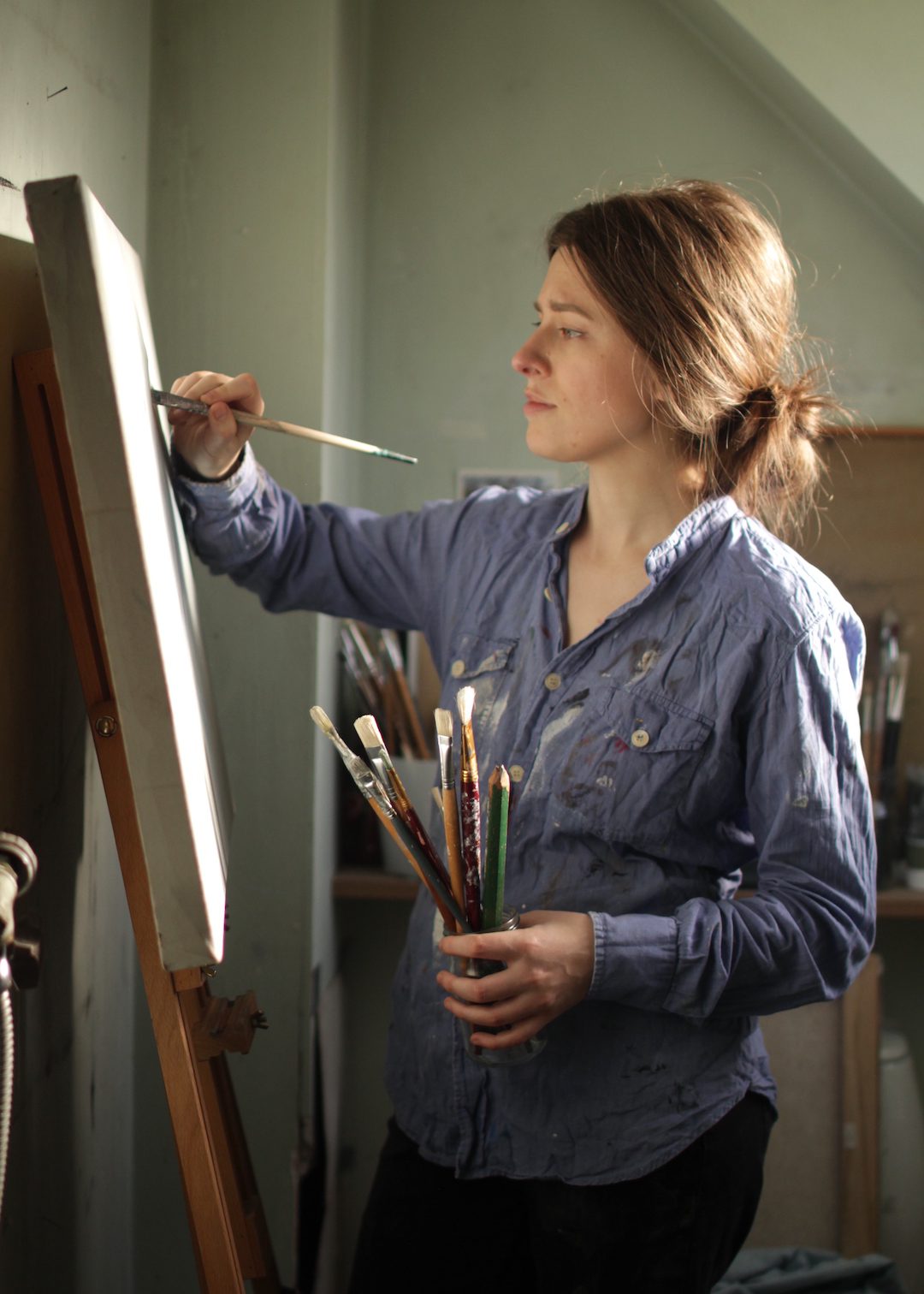 每當作畫時,她常會前往自己位於閣樓狹長空間中的小畫室。儘管畫室比大多數工作室都還小,對她來說卻是完全自由的所在。「這是個我不必擔心是否太凌亂的地方,可以盡情實驗、讓創造力完全釋放的空間。」