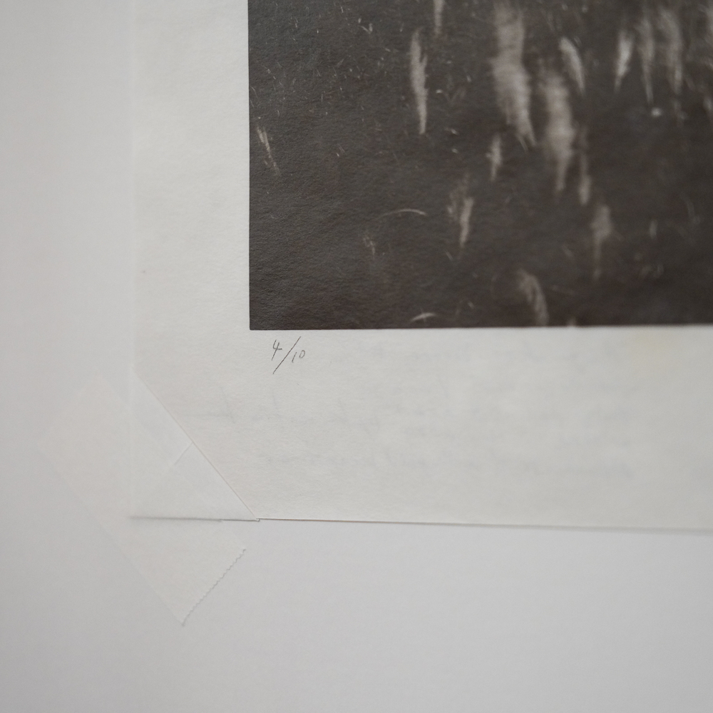 使用無酸套角固定在底版上,相紙上有藝術家簽名、版數、右下角有剛印、作品左下翻過來有書寫關於這個作品的故事。