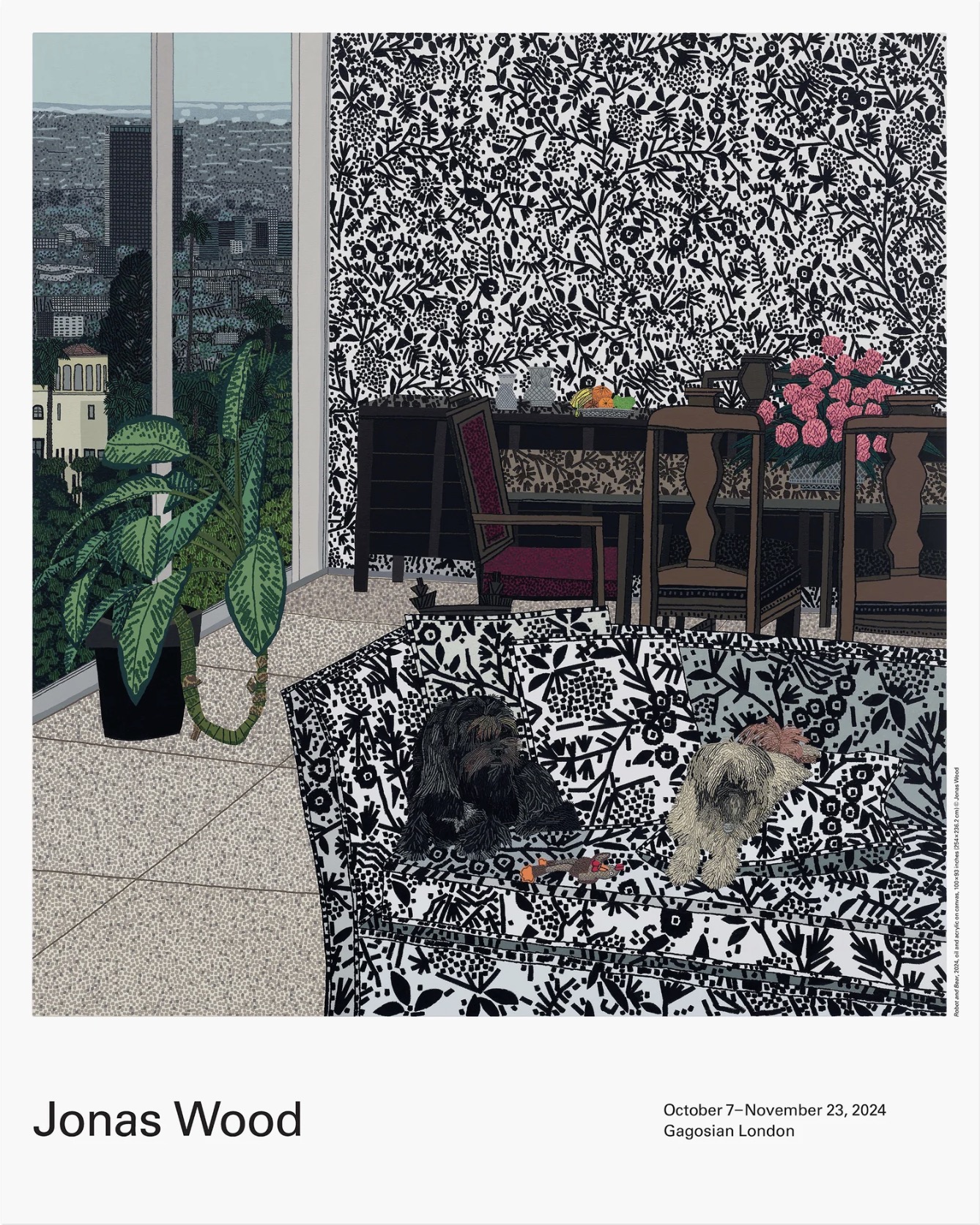 《機器人與熊》描繪了藝術家心愛的愛犬們(包括過去與現在的),牠們彷彿從室內設計雜誌的頁面中被傳送到公寓裡,正一同俯瞰著洛杉磯的景色。