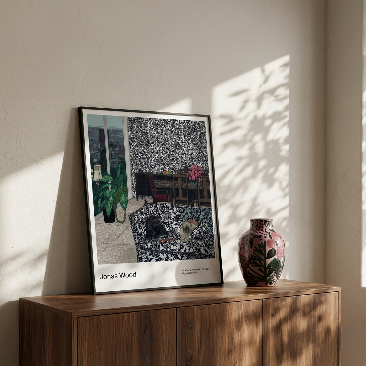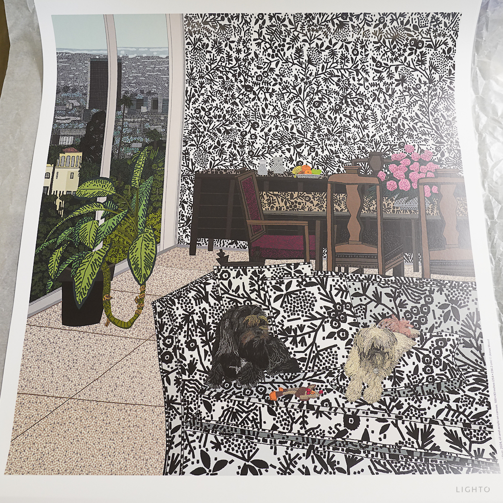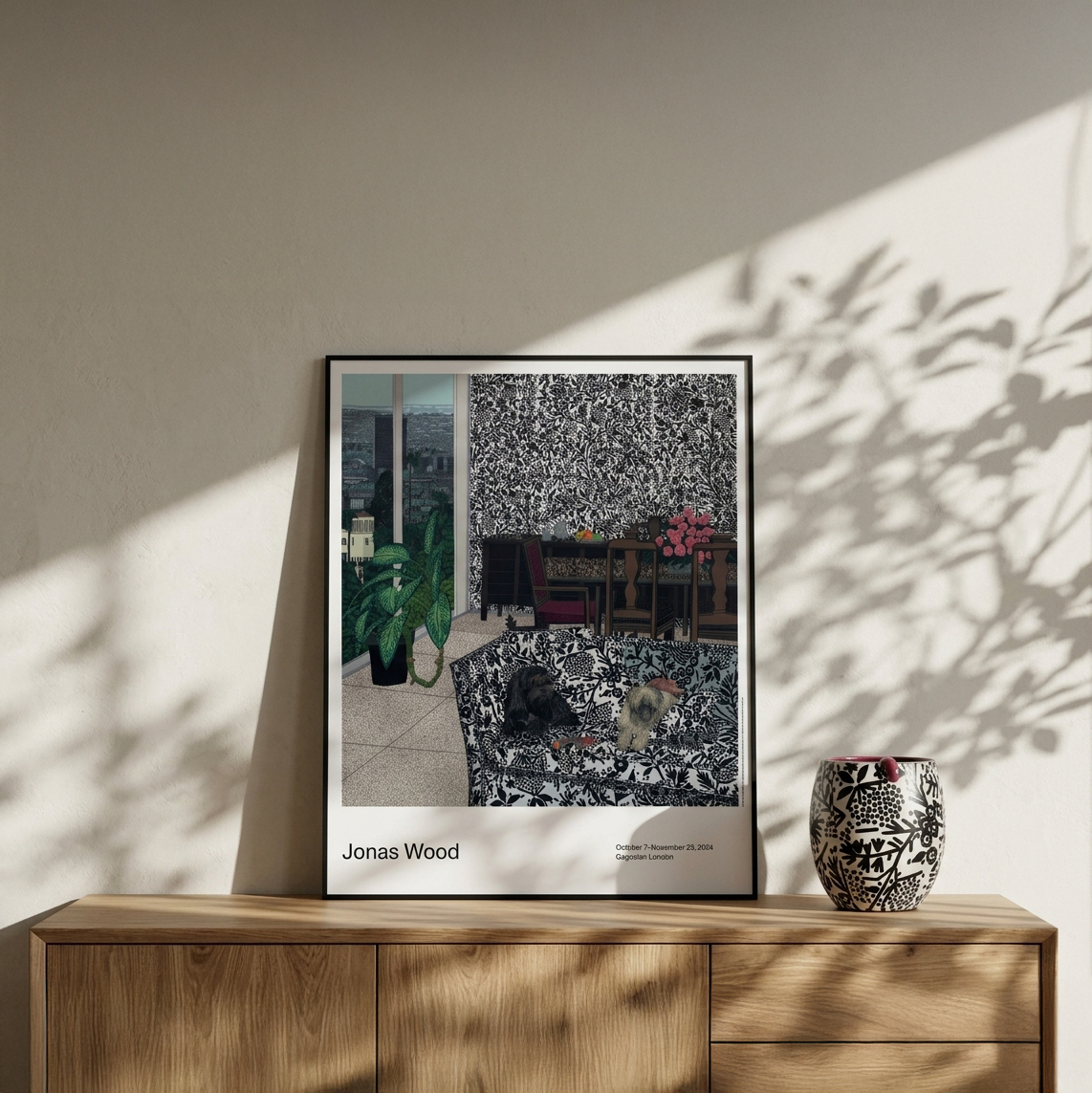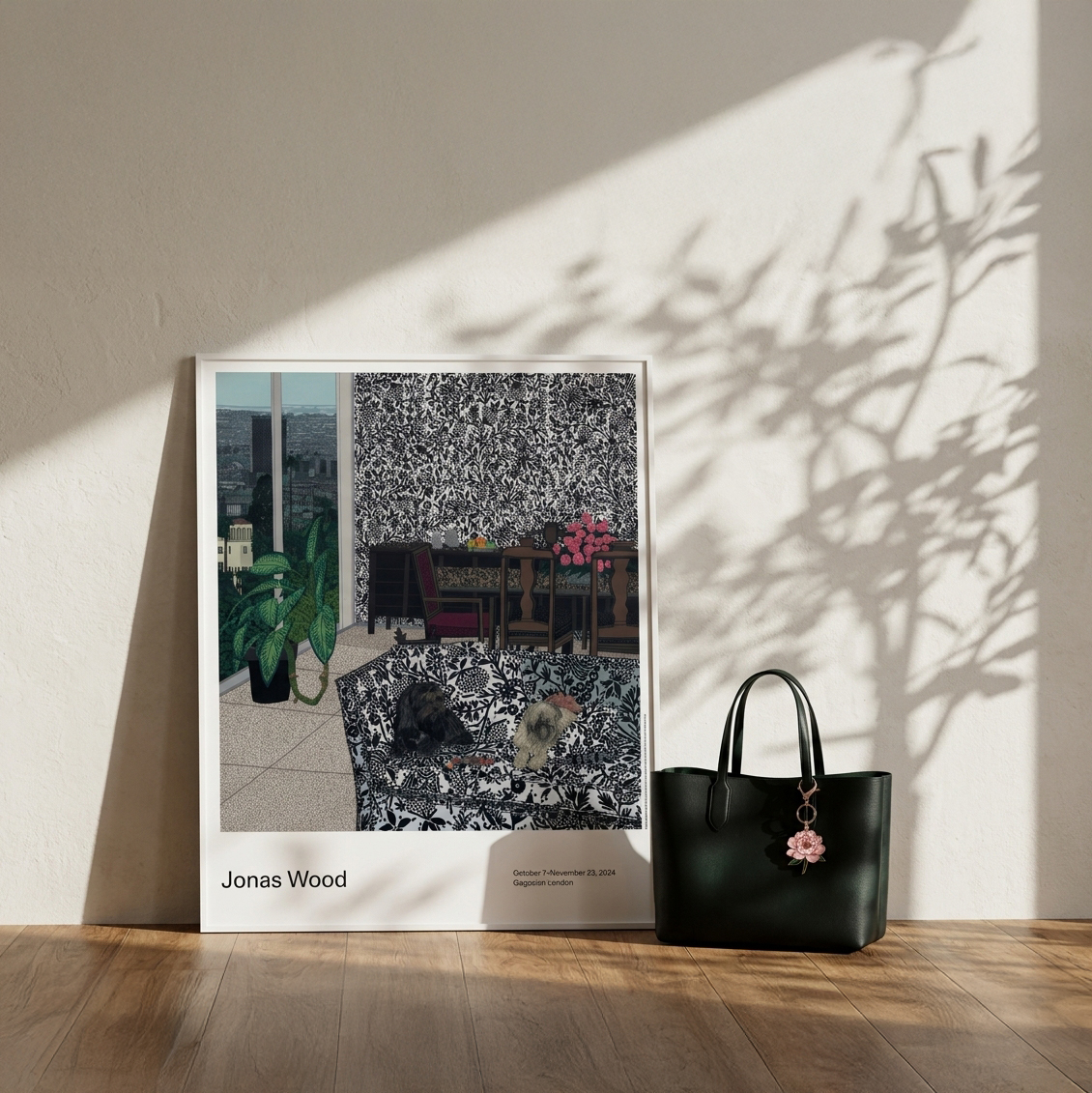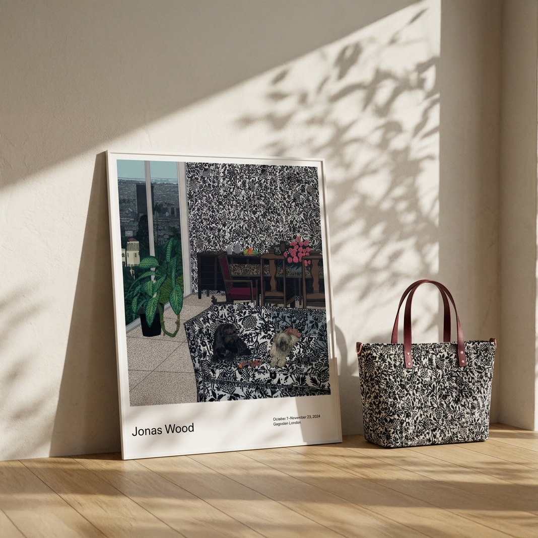 這款印有**《機器人與熊》(Robot and Bear, 2024)作品的海報於 2024 年製作,旨在配合藝術家喬納斯·伍德(Jonas Wood)**在倫敦格羅夫納山(Grosvenor Hill)**高古軒畫廊(Gagosian)**舉辦的展覽。