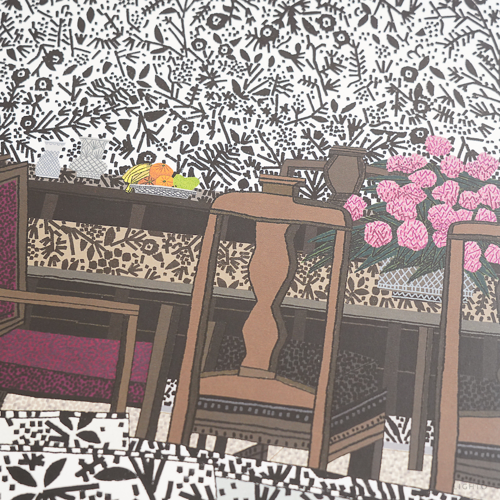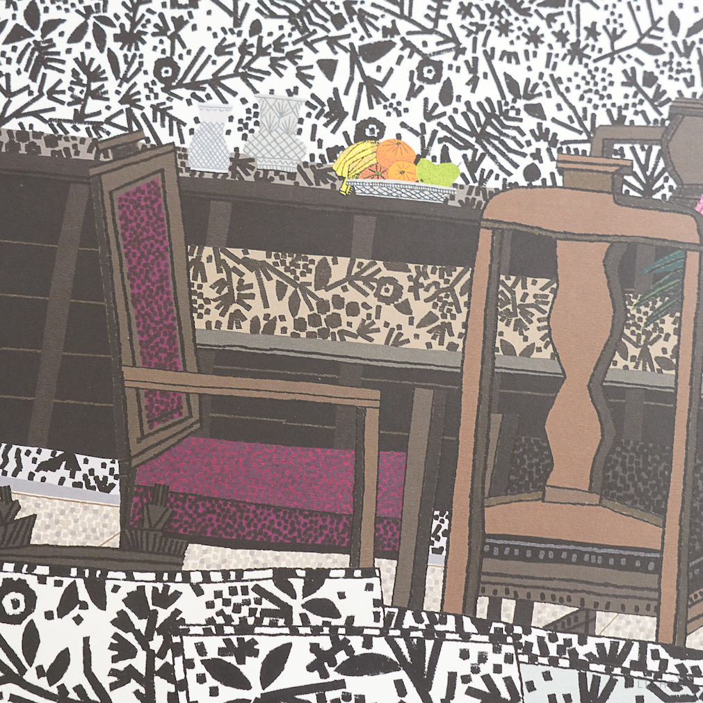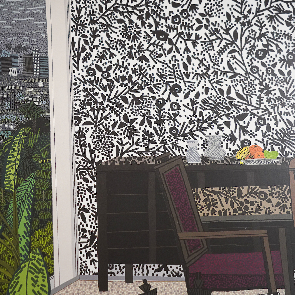 在這些新作中,伍德透過對植物、家人和室內裝潢等重複出現的主題進行詮釋,進而探索色彩、圖案與空間的表現。這些作品的特色在於對比鮮明的圖形片段所產生的視覺碰撞,以及對比例與透視的巧妙翻轉。