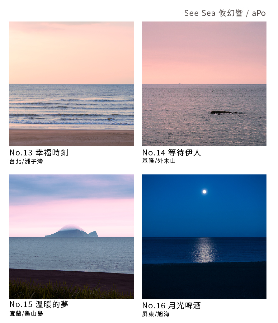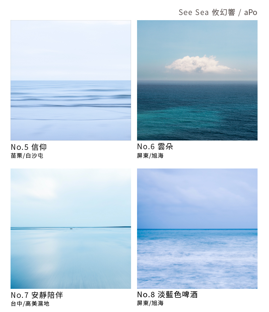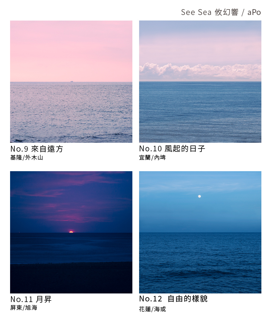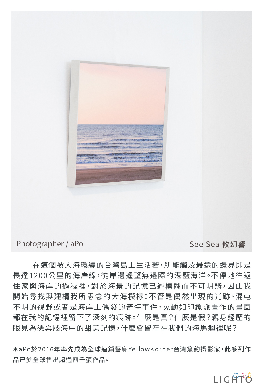 在這個被大海環繞的台灣島上生活著,所能觸及最遠的邊界即是長達1200公里的海岸線,從岸邊遙望無邊際的湛藍海洋。不停地往返住家與海岸的過程裡,對於海景的記憶已經模糊而不可明辨,因此我開始尋找與建構我所思念的大海模樣:不管是偶然出現的光跡、混屯不明的視野或者是海岸上偶發的奇特事件、晃動如印象派畫作的畫面都在我的記憶裡留下了深刻的痕跡。什麼是真?什麼是假?親身經歷的眼見為憑與腦海中的甜美記憶,什麼會留存在我們的海馬迴裡呢? *aPo為台灣最早進入全球連鎖藝廊YellowKorner 的攝影師,此系列作品已於全球售出超過三千張作品。