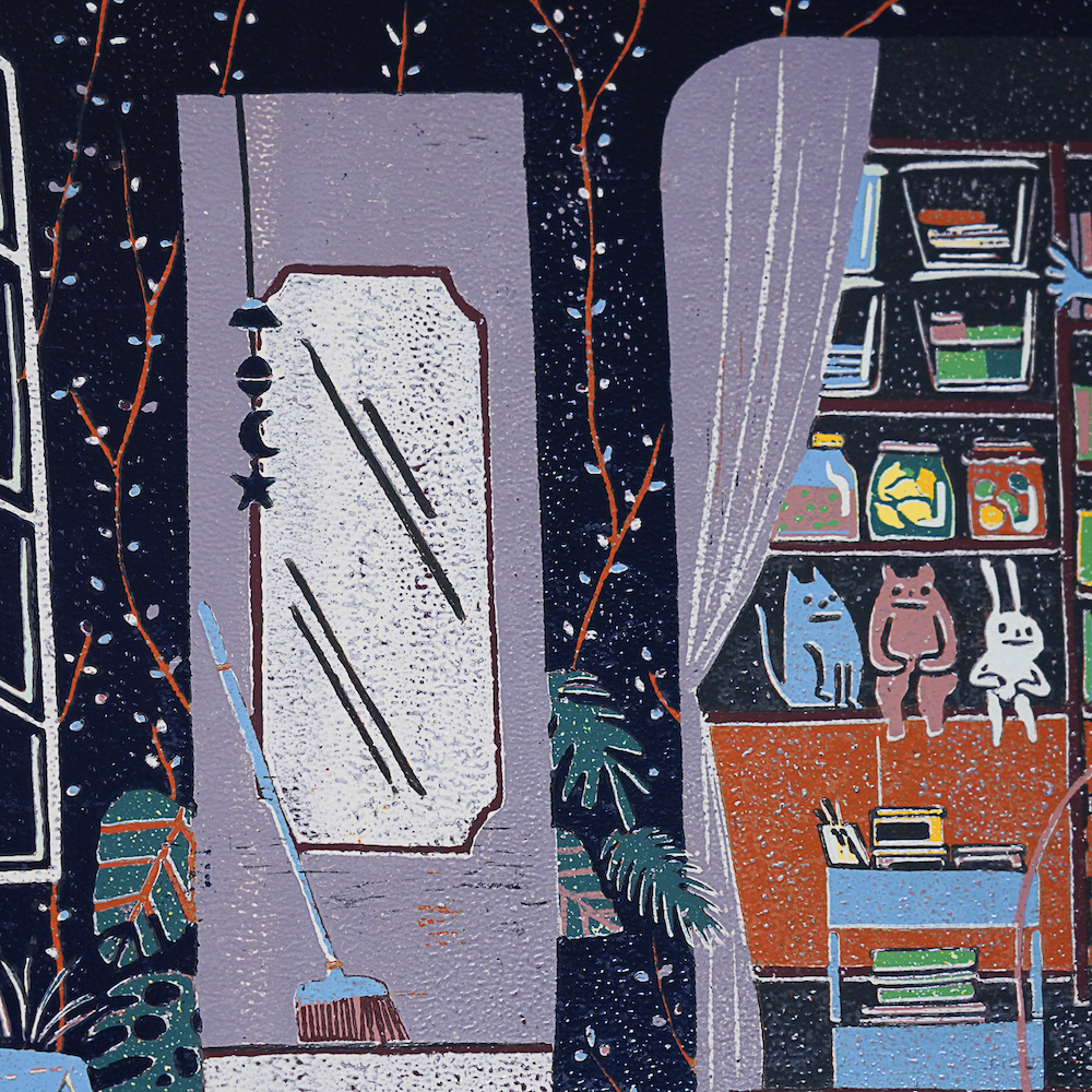 因版畫製作過程,顏料難免沾染到紙白部分,故此系列作品統一加上卡紙